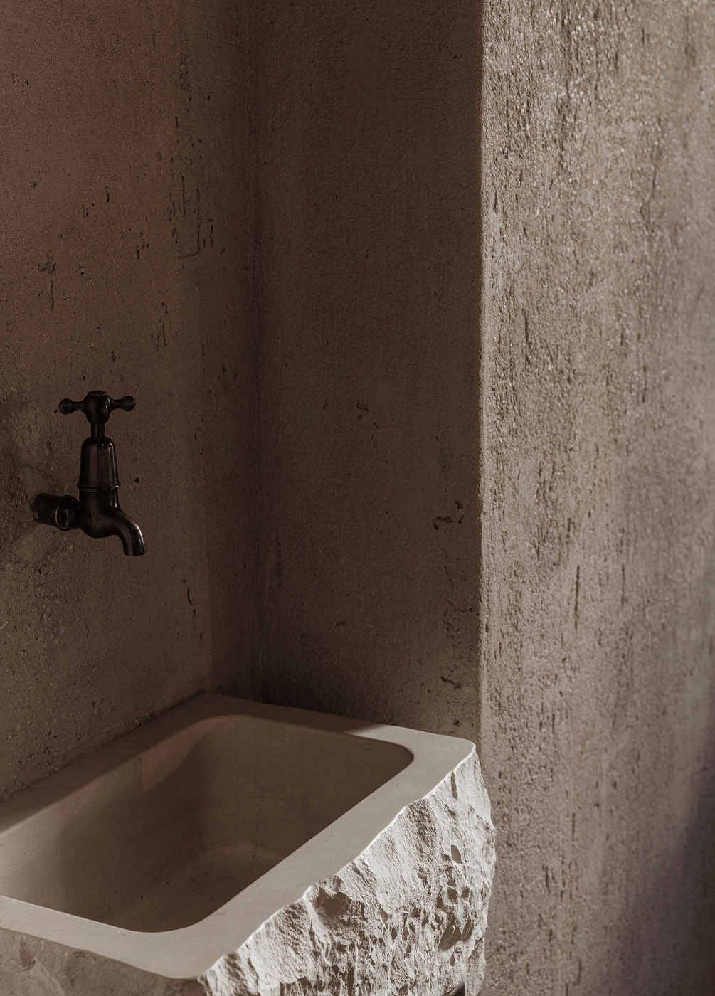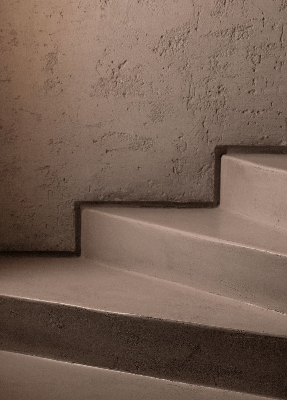 This distinction — between what is seen and what is felt — defines its role within the project. Clay is not there to be read as a material statement. It is there to support a condition. To allow the space to hold itself with a certain stillness.